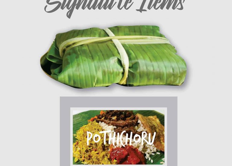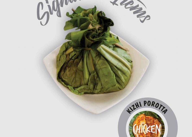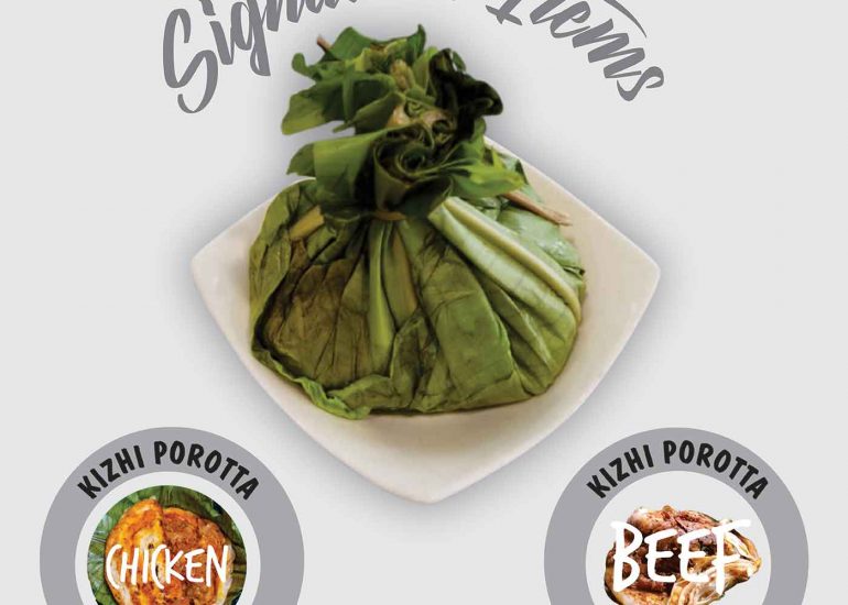 Cooked porotta stuffed with fried curry meat (beef or chicken), wrapped in a banana leaf and tied into like a parcel with a knot on the top